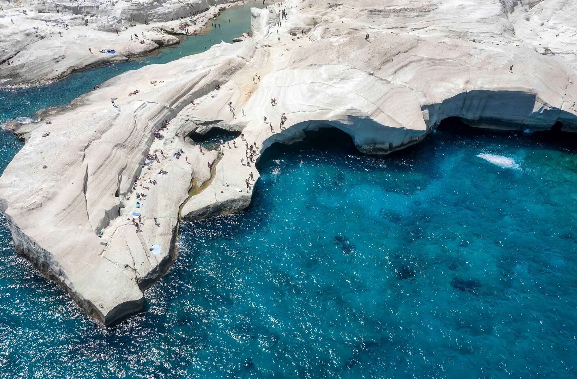 With over 40 beaches, each one different in color and character, Milos is a paradise for sea lovers. Visit Sarakiniko, the moonlike landscape of white volcanic rock, or Kleftiko, where caves and crystal blue waters invite you to dive in and explore. As night falls, the port of Adamas is the perfect spot for a memorable dinner by the water.