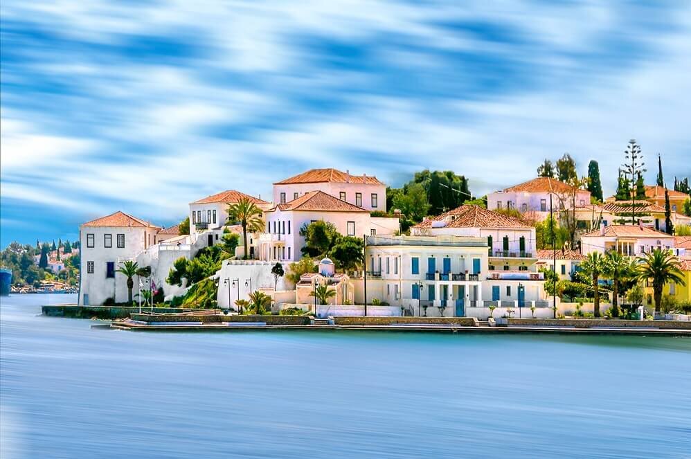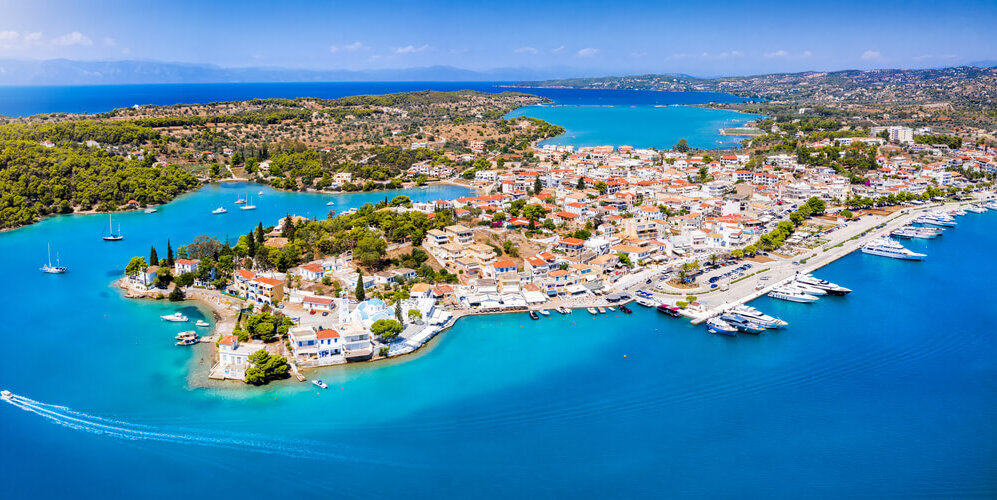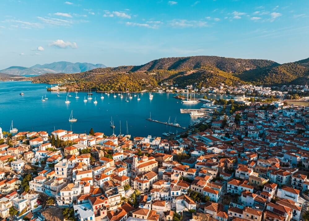 Poros, also known as the “little Venice” of the Saronic islands, is a tranquil island with many taverns neoclassical buildings, and marinas.